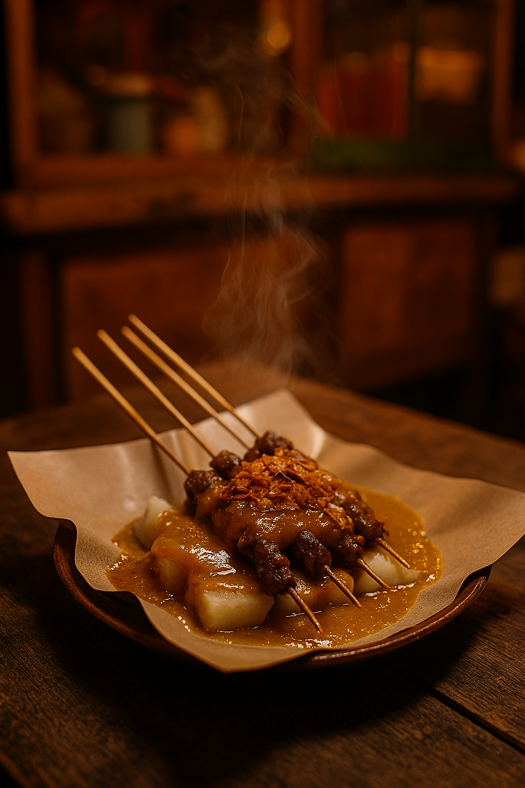 Saté Padang is een van de meest bijzondere en uitgesproken saté-varianten van Indonesië, afkomstig uit de regio Padang in West-Sumatra. Het gerecht staat bekend om zijn dikke, kruidige, goudgele saus en zijn intense smaak, die flink verschilt van de zoetere Javaanse saté’s.