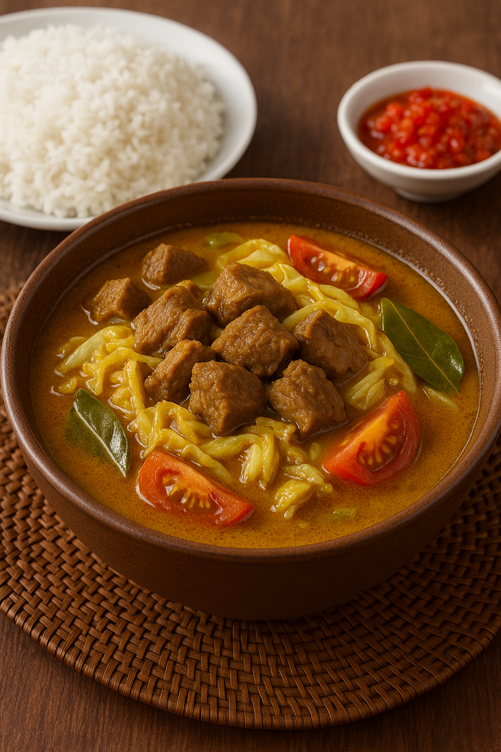 Javaans gerecht genaamd "Gulai Kambing" – een heerlijk stoofpotje van geitenvlees in een milde curry. Dit traditionele gerecht zit bomvol kruiden en wordt vaak langzaam gegaard, zodat het vlees supermals wordt en alle smaken lekker diep intrekken.