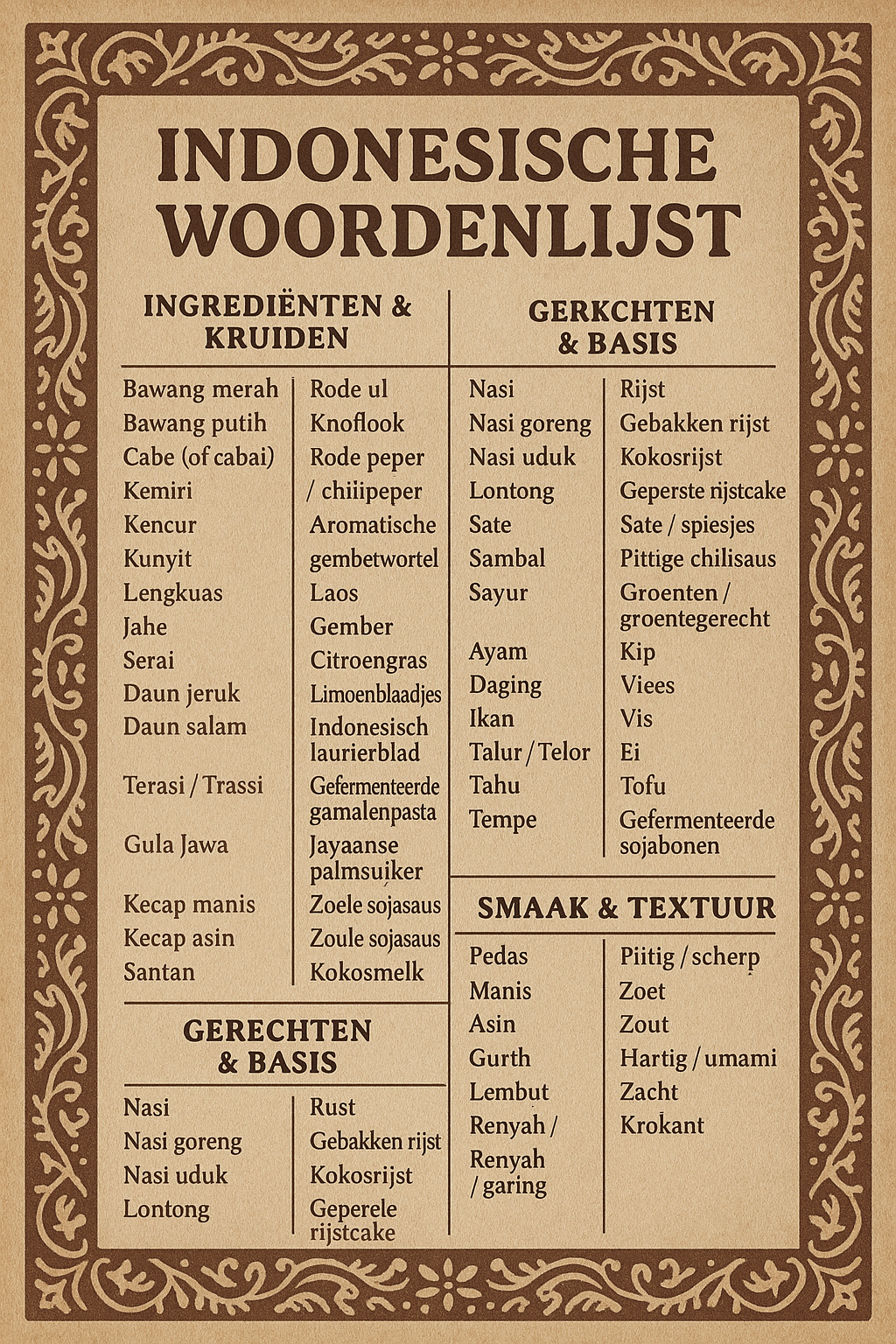 Onderstaande lijst kan je helpen bij het identificeren en begrijpen van deze woorden, zodat je met vertrouwen Indonesisch kunt koken.